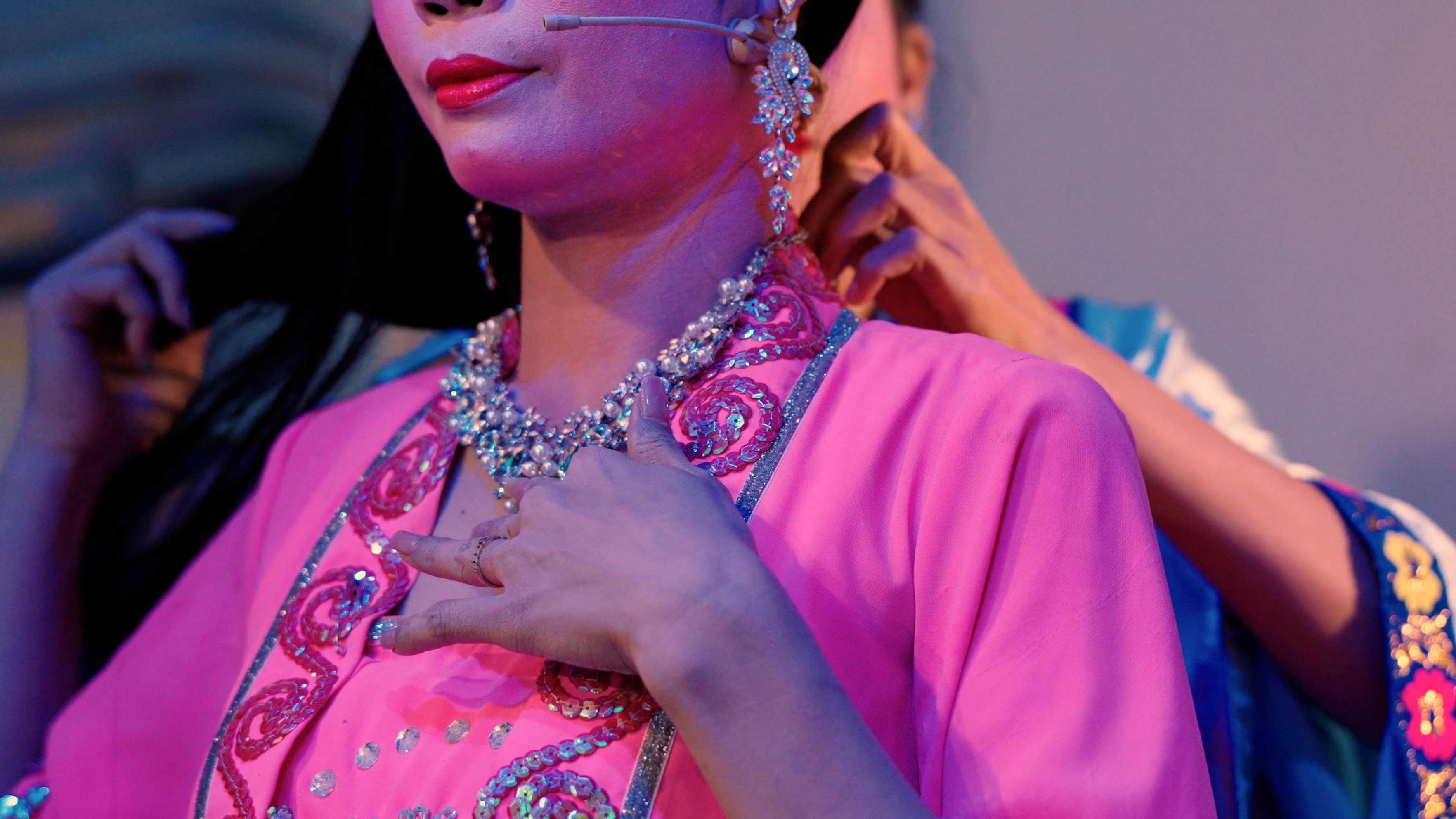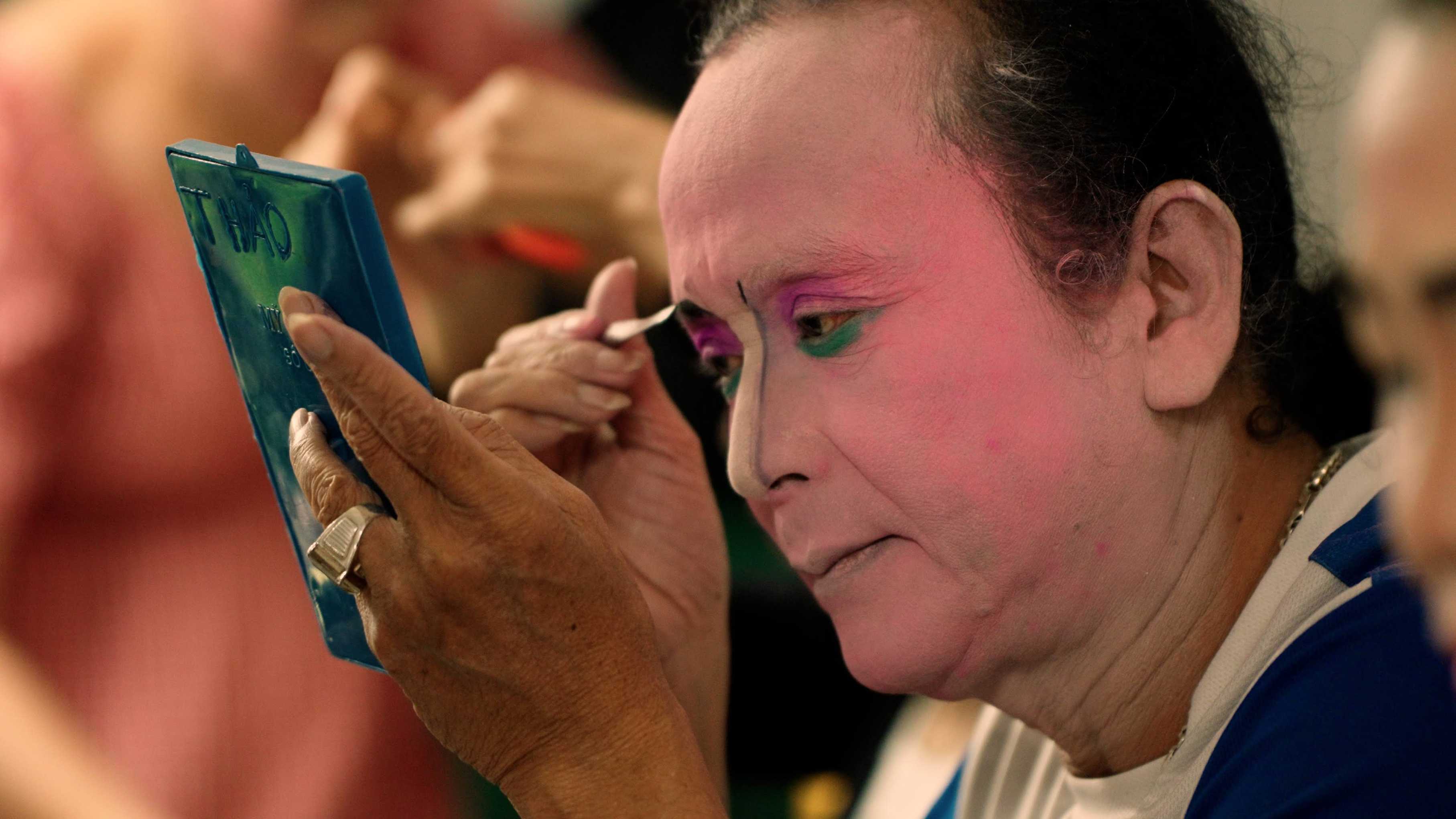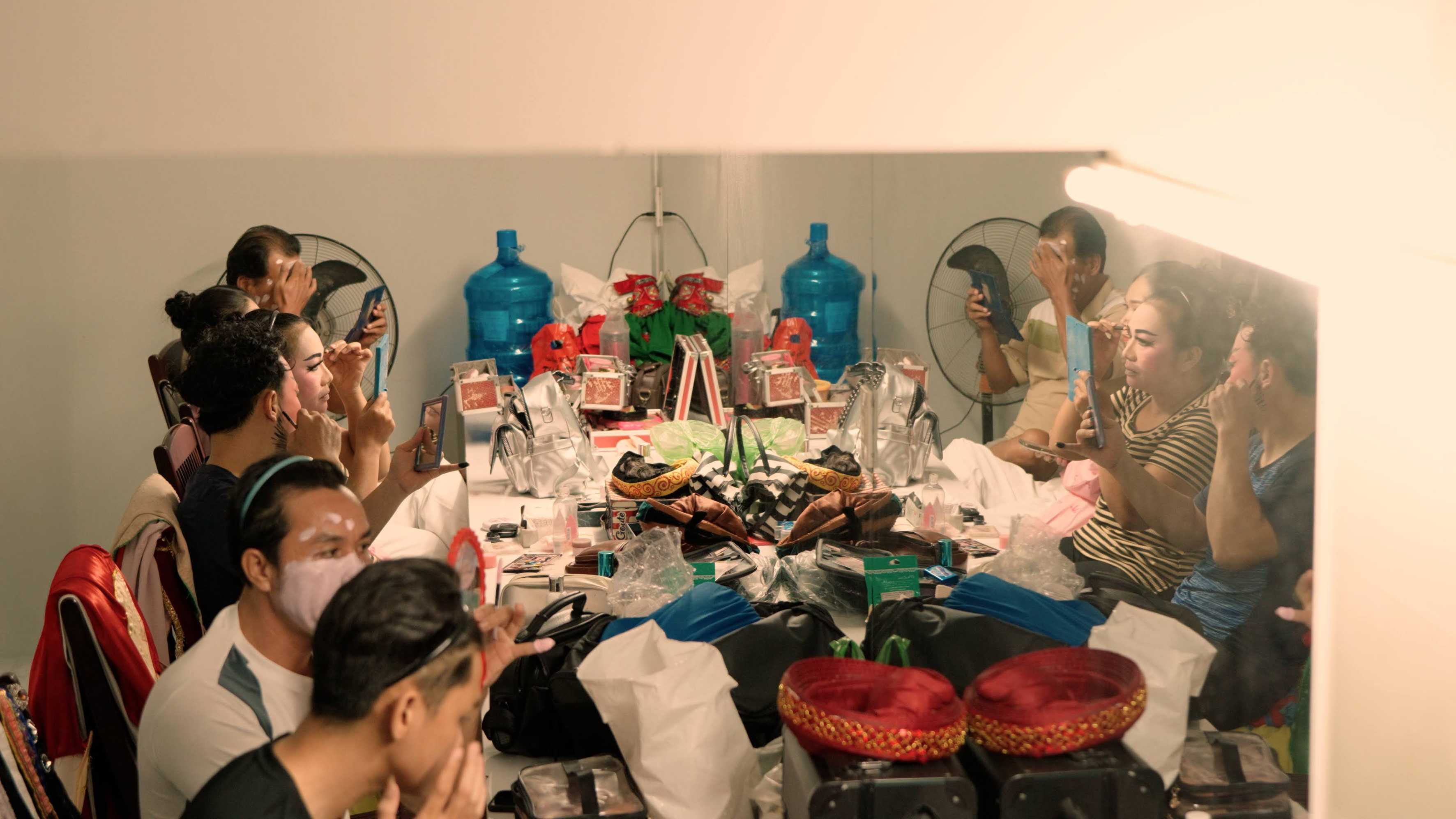 Trước giờ biểu diễn, hậu trường của Nhà hát Thành phố Nha Trang luôn nhộn nhịp và đầy màu sắc. Các nghệ sĩ tuồng tập trung trong phòng hóa trang, tỉ mỉ từng đường cọ để hóa thân vào nhân vật.