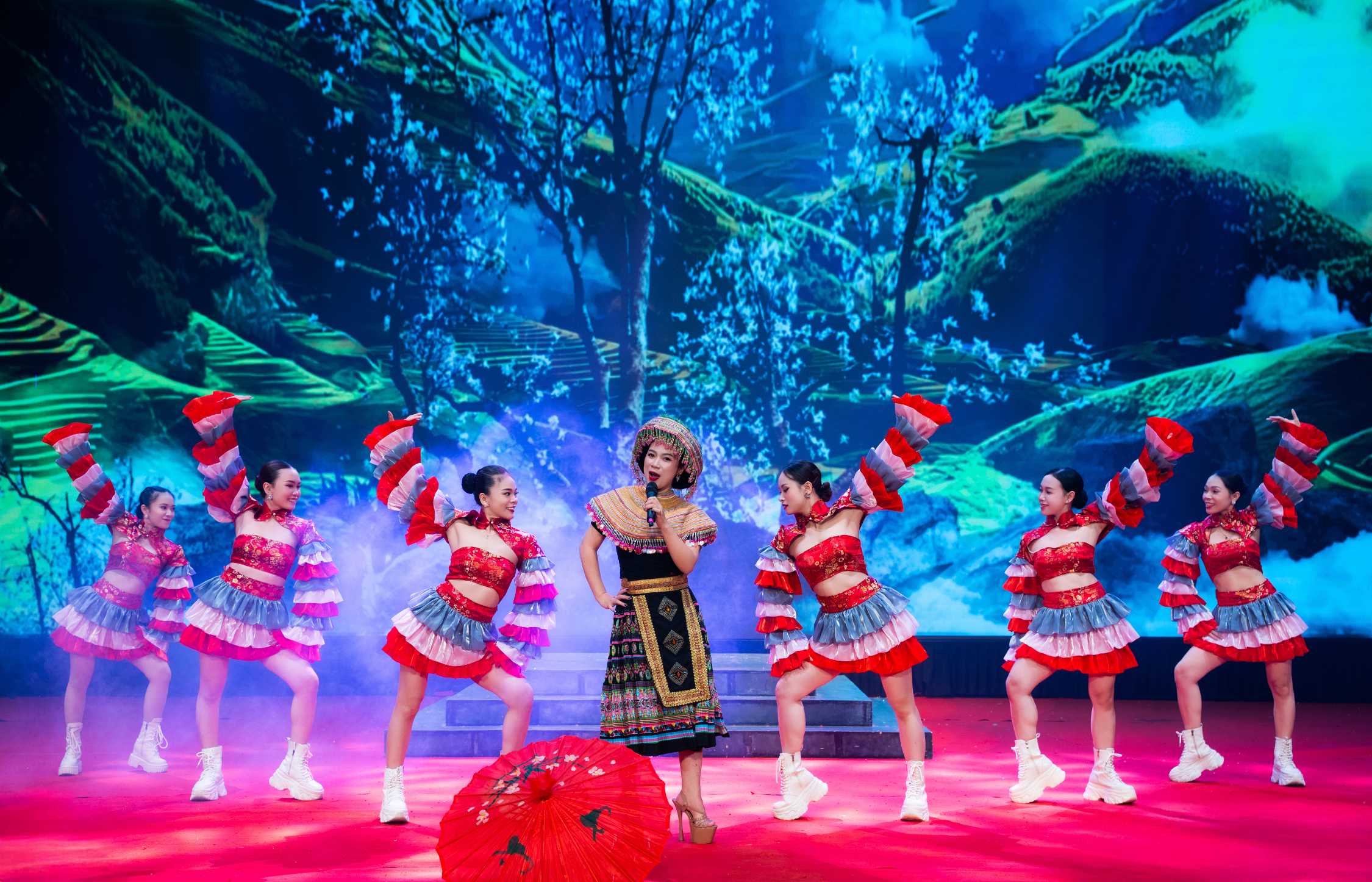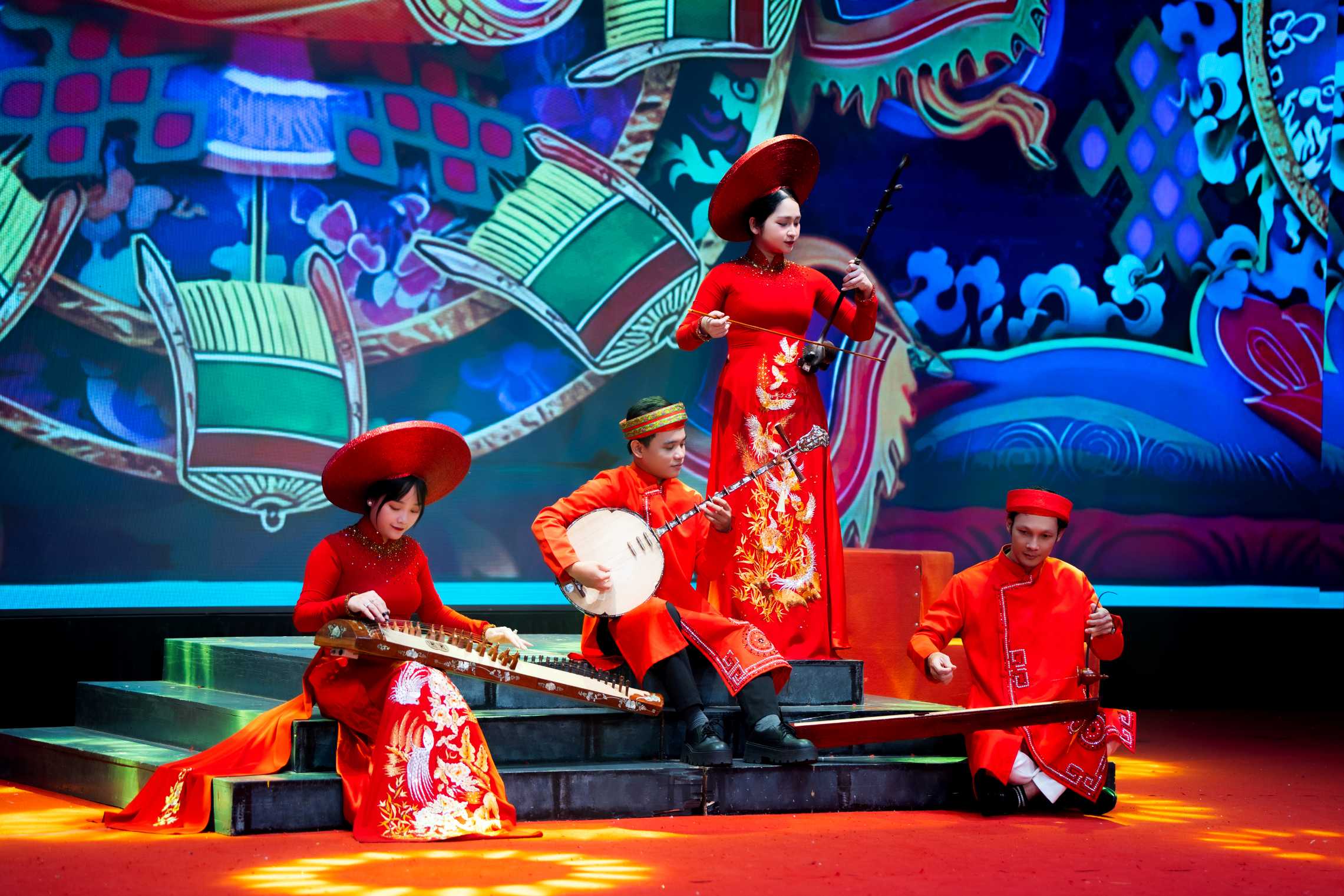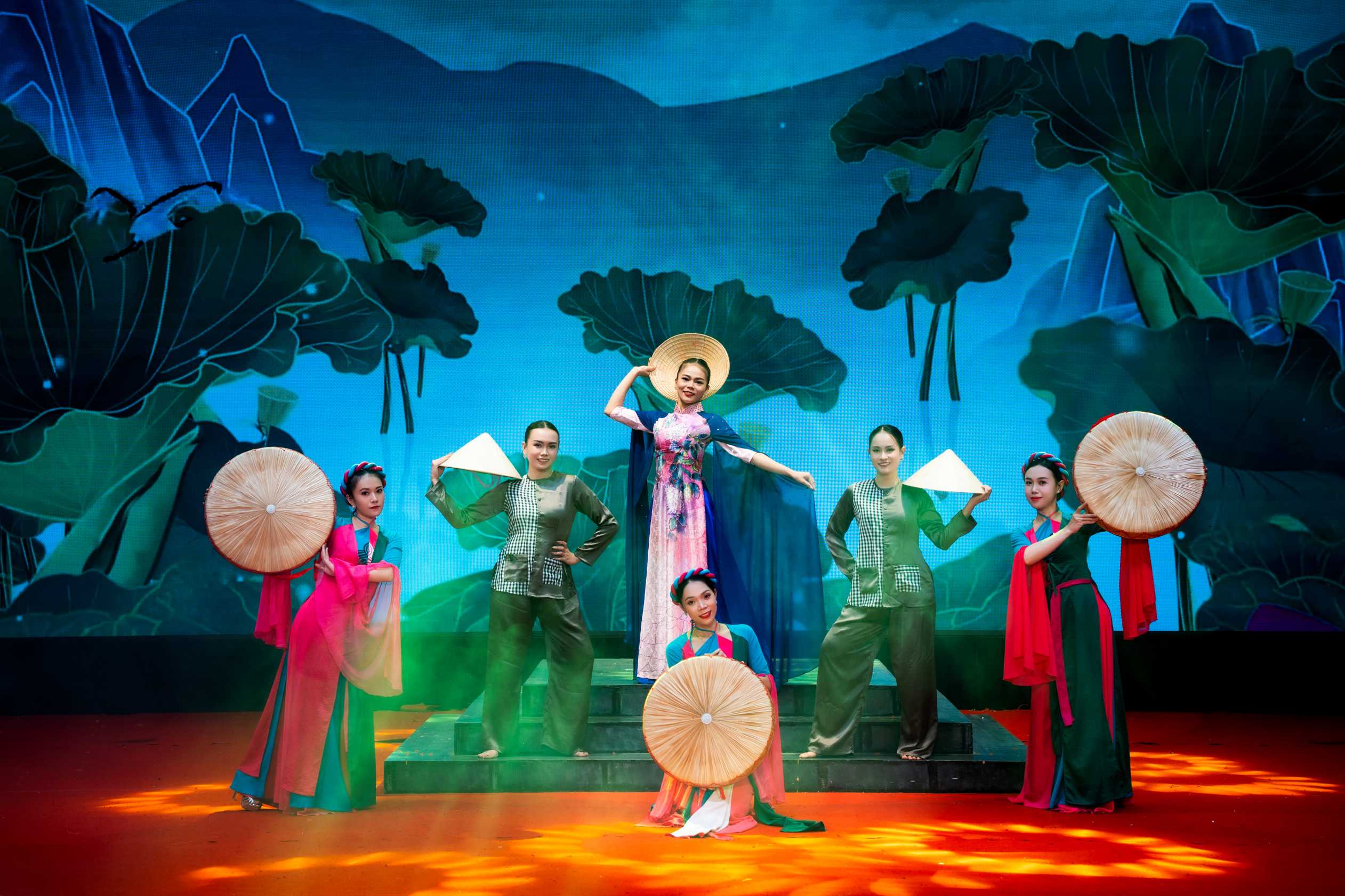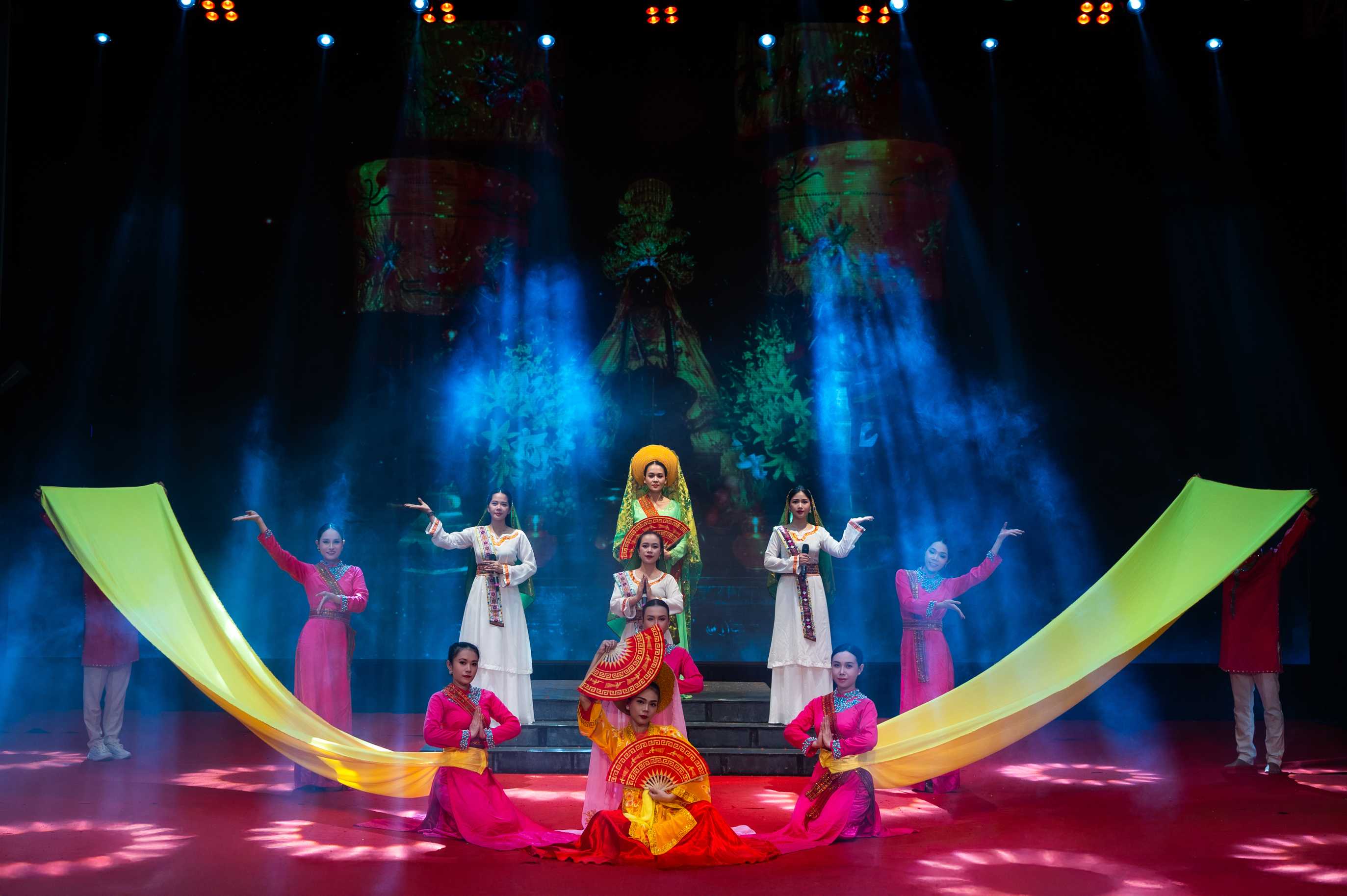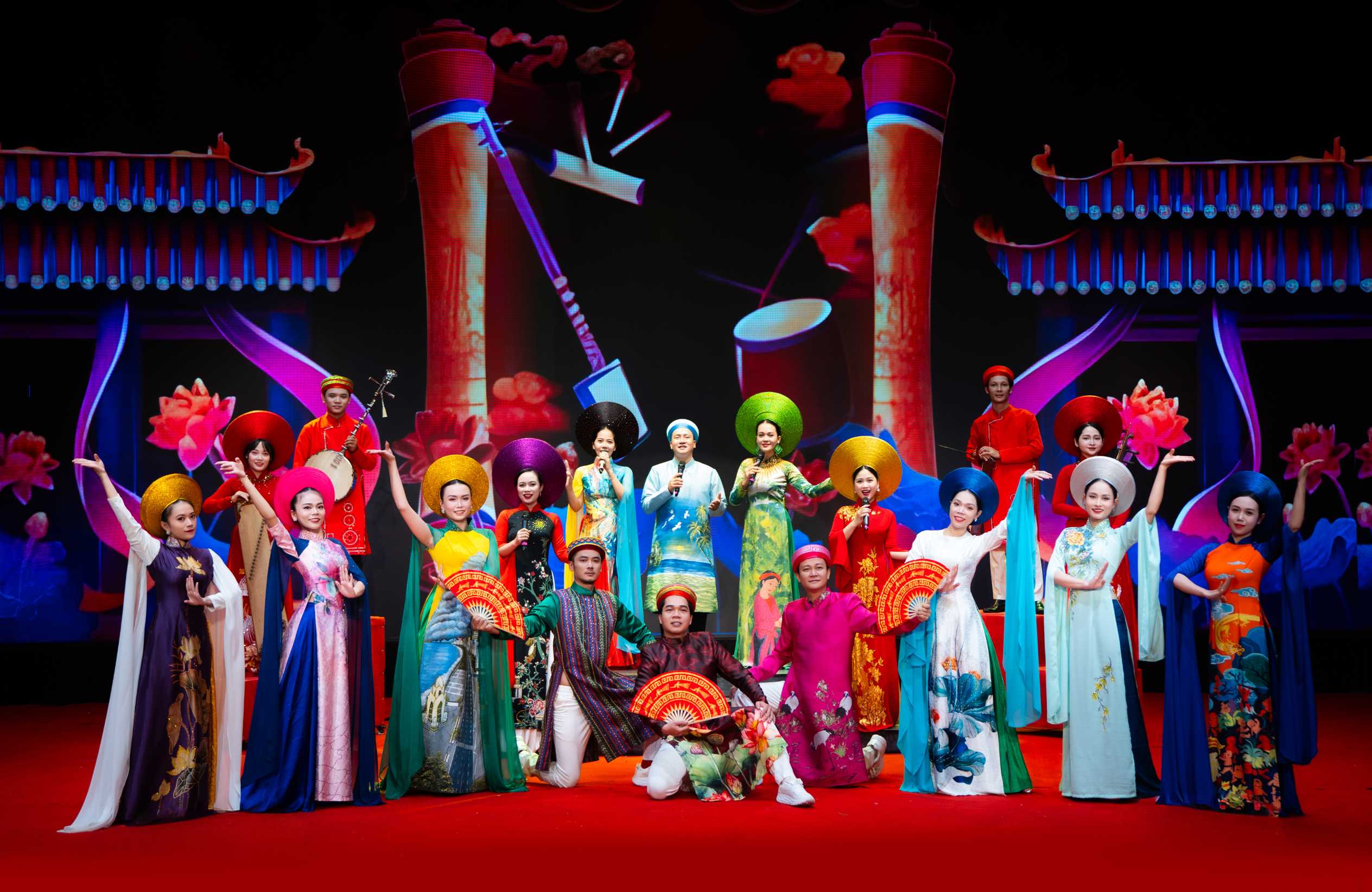 Trên sân khấu rực rỡ ánh đèn, từng tà áo dài, từng tiếng trống, tiếng đàn bầu, đàn nguyệt vang lên hòa quyện cùng giọng hát, điệu múa, tái hiện vẻ đẹp tinh tế và sâu lắng của văn hóa Việt. Mỗi tiết mục, mỗi vở tuồng được dàn dựng công phu đều mang trong mình hơi thở của quê hương, của những làn điệu dân ca, những câu chuyện lịch sử thấm đẫm tình người.